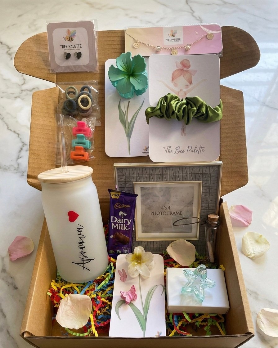 All items are curated with care and beautifully presented on a bed of multi-colored crinkle paper for a vibrant and memorable gifting experience.