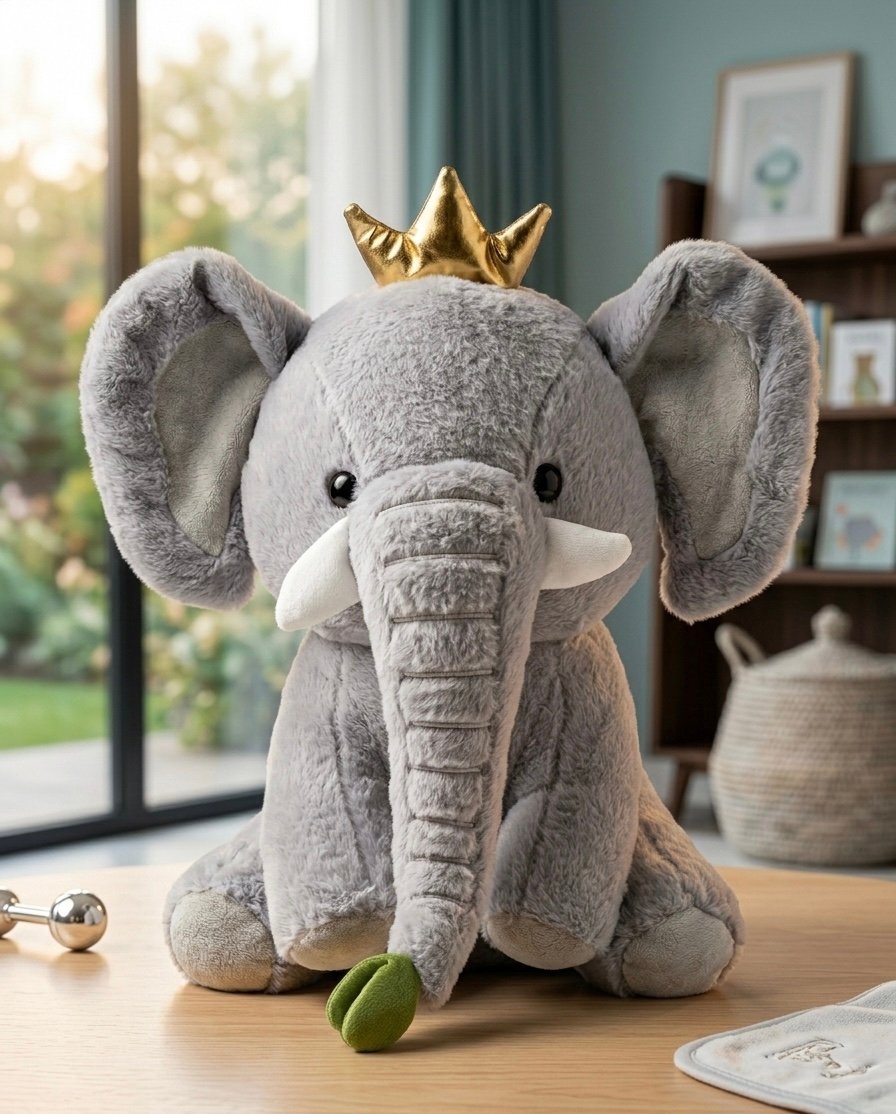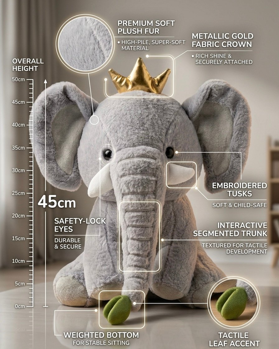Add a touch of noble charm to your child’s room with our Majestic Grey Elephant Plush. This ultra-soft, textured elephant is designed with premium faux-fur and regal accents, making it a standout piece for any nursery.