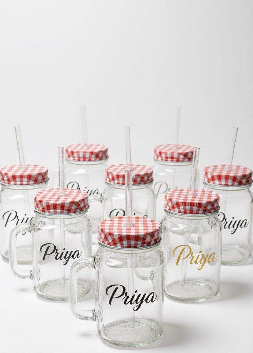The jar is customized with a bold, permanent vinyl name decal (e.g., “RAVI”) that is professionally applied to stand out. It makes finding your drink at a party effortless and turns the mug into a fantastic, thoughtful gift.