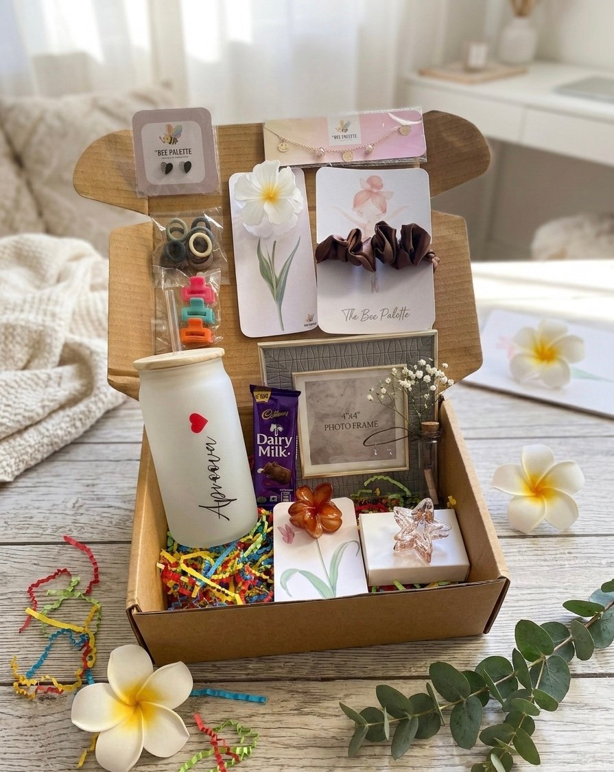 Celebrate any special occasion with a thoughtfully curated gift box designed for style and utility. This premium hamper features a personalised frosted glass tumbler with custom calligraphy, a sleek 4″ X 4″ photo frame, and a selection of chic accessories, including silk scrunchies, dainty jewellery, and floral-themed accents. Topped off with a sweet treat and colourful confetti, it’s the perfect all-in-one gift for birthdays, bridesmaids, or “just because” moments.